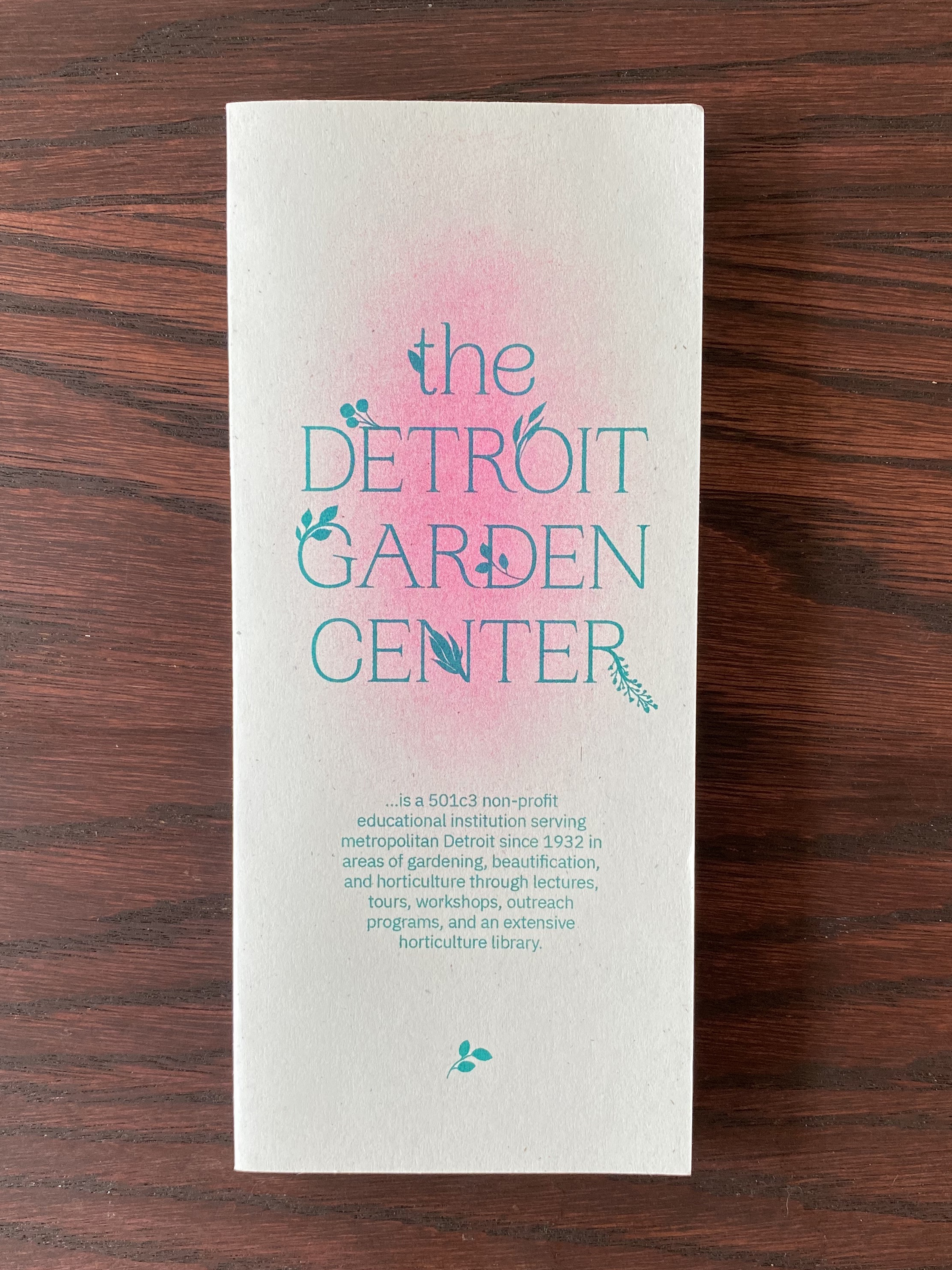 Founded in 1932, The Detroit Garden Center was an indespensible resource for horticulturalists in the Detroit area for many decades. For its final event before closing in 2021, I was asked to design a brochure that highlighted a few moments from the Center’s history. Emphasis was placed on the statue of St. Fiacre, the patron saint of gardens, as well as the many locations the Center inhabited over the years.
