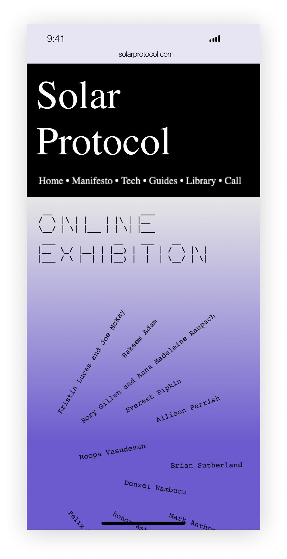 As a designer who thinks a lot about how to move forward in a warming world, this project was a welcome challenge. Solar Protocol, a website hosted on servers around the world, each powered by the sun, was having an exhibition. In the exhibition, works were to be hosted on the server and displayed in a special section on the site, which I was to design and develop.